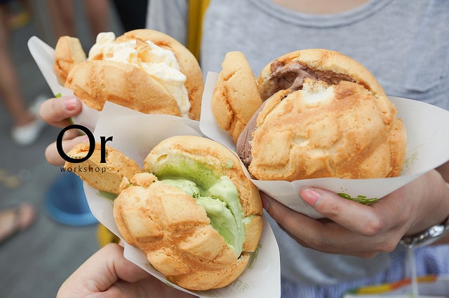 終於開幕了~來自日本金澤的現烤冰淇淋菠蘿麵包(超饒舌) Big Size的菠蘿麵包,外皮脆硬,內裡夾了三種口味的明治冰淇淋 世界第二好吃現烤冰淇淋菠蘿麵包